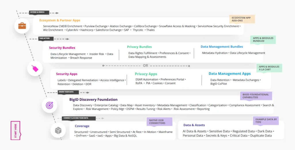 Under the hood, BigID Next is a microservices-based solution that leverages Docker containers and Kubernetes, and is deployable in on-prem, cloud, and hybrid environments, either self-managed or as a SaaS. The platform is highly modular, and you can deploy it in its entirety or start with a small deployment and grow it over time, as you prefer. While its discovery capabilities are foundational, you can build on them via various data management, privacy, and/or security applications (such as DSAR (Data Subject Access Request) automation, data lifecycle management, policy-based privacy automation/regulatory compliance, data loss prevention, risk management, and so on) provided by BigID, available either individually or bundled by use case (as shown in Figure 1). Various applications from partner companies are also available.