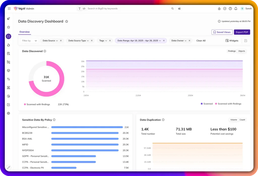 The actual discovery process leverages AI and LLMs on top of more traditional discovery techniques. Over 1000 (in fact, closer to 1300) classifiers are available out of the box, and include multilingual support and metadata classification. You can also build your own. Different algorithms are used depending on the source, and can examine both data and metadata: for instance, for structured data the platform might use correlation-based machine learning and metadata enrichment, while for unstructured data it could employ a neural network based on named entity recognition. Regardless, discovery is typically “context-aware”, meaning that it uses AI to help determine meaning (and sensitivity) based on the surrounding context. For instance, this can be used to recognise this difference between “Dakota”, the name of a person (and therefore sensitive), and “Dakota”, one of the many places of the same name (and not, as a rule, sensitive). The end result of all of this is that BigID is able to claim an over 97% accurate identification rate for sensitive data.